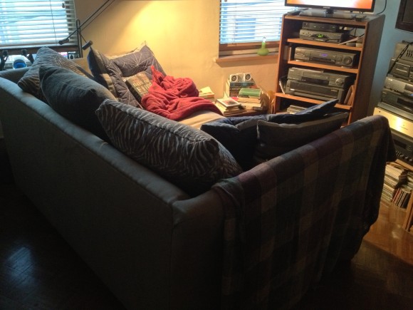 Your place is wonderful. Do you ever share your Room of Madness? I would love to curl up on that couch with you and watch movies and read books until my eyeballs sue for permanent separation. I can’t complain, though. Cats and I arrange ourselves in the recliner, now creaking with age and discontent, and watch movies and read and nap. It’s great to have a hunker-down spot, isn’t it?